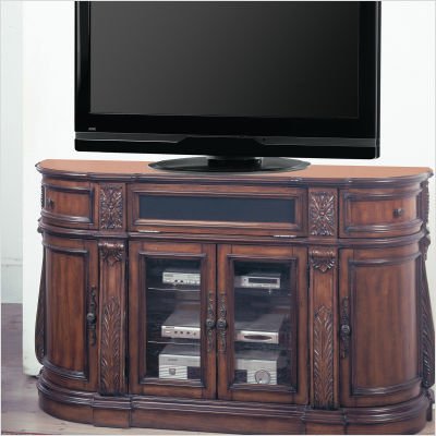 SOR870 Features: -TV Stand. -Antique pecan finish. -Poplar solids with birch veneer construction. -European classic style. -Includes 2 adjustable shelves, 2 glass doors, 2 curved panel doors and 3 drawers. -Includes center channel speaker grill insert. Read more...