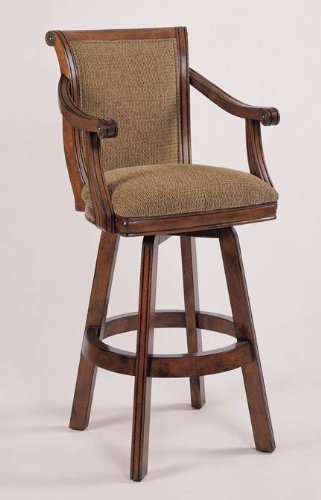 Casual, easy living design. Features include a strong frame on a self-return swivel with metal clad foot rail. Generous woven webbing supported seat with sweeping open arm design for added comfort and support. Finished in a lightly distressed warm cherry with a satin sheen. Upholstered in a resilient Light Brown 25% cotton, 75% polyester fabric. Some assembly required using 10-bolt construction. Read more...