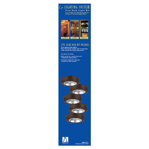 9890-171 Features: -Five light disk light kit.-Housing finish: Painted antique bronze.-Trim finish: Painted antique bronze.-Reflector finish: Satin aluminum.-Housing construction: Polycarbonate.-Trim construction: Polycarbonate.-Reflector construction: Anodized aluminum.-Includes 72'' of wire.-cETL and ETL listed for wet locations.-Eco friendly.Specifications: -12 Volts.-Accommodates (5) 18W wedge T5 fluorescent bulb (included).-Overall dimensions: 0.87'' H x 3.125'' W x 3.125'' D.For more information on this product please view the Sheet(s) below:Disk Light Kit Specification Sheet Read more...