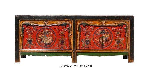 This is a Mongolian painted cabinet which is hand made of natural elm wood. It still keeps perfect original painting on it. Its front door painting represents flowers and vases. Right now, the cabinet can be used as flat screen LCD/ Plasma TV cabinet, and its shelf can be put CD/DVD player. It should be great to put in your house.Outside Dimension: 90"Wx17"Dx32"HOrigin: Northern ChinaMaterial: Elm Wood Period: 1900+- Read more...