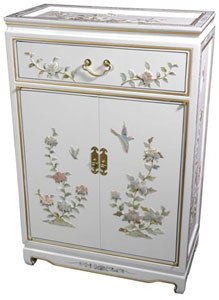 Truly beautiful oriental cabinets, with exquisite quality fine Chinese lacquer finishes. The white and black lacquer designs are decorated with authentic hand carved and lacquer mother of pearl applique as shown, and the gold leaf lacquer design is decorated with an elegant, colorful, beautiful male peacock hand painted on the doors. Each peice is a work of master craftsmanship, no two exactly the same, each a one of a kind work of art. Browse our entire selection of fine Chinese lacquered furnishings and home decor on Amazon.com. Orders ship next business day, professionally packed, fully insured from our Massachussetts warehouse via Fed Ex, with expedited delivery available. Read more...