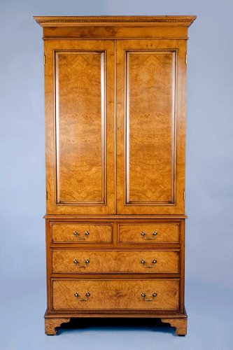 This beautiful walnut linen cabinet was recently crafted in England as a Georgian period reproduction. The burl walnut looks beautiful, with a pronounced grain and a rich complexion, while the swan neck brass pulls contrast beautifully with the wood. The two locking cabinet doors open to reveal adjustable shelves and a pull-out slide, which is ideal for media components. Each of the four drawers also features dovetailed joints, indicating fine quality. Conveniently, this linen cabinet disassembles into the top and bottom sections for shipping and easy movement. Because this linen cabinet is brand new, it is in excellent condition and would make a fine addition to any furniture collection.