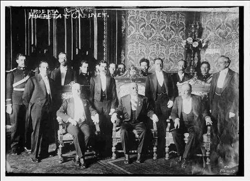 Printed at 11 x 14 inch and mounted to foam board The George Grantham Bain Collection represents the photographic files of one of America's earliest news picture agencies. The collection richly documents sports events, theater, celebrities, crime, strikes, disasters, political activities including the woman suffrage campaign, conventions and public celebrations. The photographs Bain produced and gathered for distribution through his news service were worldwide in their coverage, but there was a special emphasis on life in New York City. The bulk of the collection dates from the 1900s to the mid-1920s, but scattered images can be found as early as the 1860s and as late as the 1930s. Reprint Huerta and cabinet 1910. Read more...