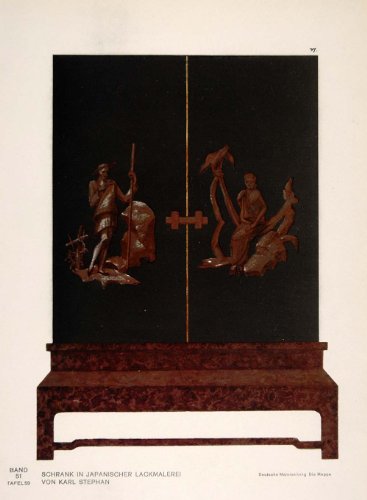 This is an original 1931 three-color lithograph of an Art Deco Japanese lacquer cabinet by Karl Stephan. (Please note that the areas of gold ink appear dull brown in our digital image.)