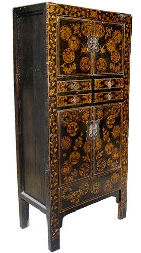 A beautiful decorative cabinet, an authentic Chinese antique design, crafted from solid, durable Elm wood, finished in a fine black lacquer. The lacquer has been decorated with an authentic period hand painted oriental design, adding beauty and color to the fine form and robust construction. Classic oriental style metal hasp medallions finish the cabinet doors beautifully, creating an attractive and useful cabinet, the decorative focus of any room where it's placed. Refurbished in a workshop in Shangxi, this is a one of a kind peice of furniture, restored from a cabinet crafted in the late nineteenth century. Orders are shipped next business day from our Massachussetts warehouse, professionally packed, fully insured via Fed Ex freight, curbside delivery. Browse our entire selection of fine refurbished Chinese country antiques on Amazon.com Read more...